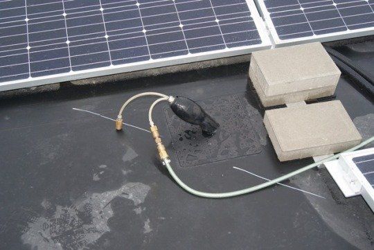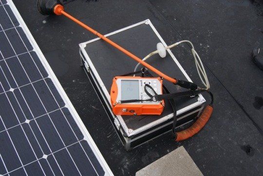 Abgesichts des Dachaufbaus (Warmdach) und der verlegten elektrisch leitfähigen EPDM-Abdichtung entschied man sich für eine Leckortung mit Tracer Gas. Dabei wird ein Gasgemisch, bestehend aus 95% Stickstoff und 5% Wasserstoff, so lange unter die EPDM-Abdichtung eingeblasen bis ein messbarer Austritt bei den Anschlüssen, insbesondere der Attika, zu verzeichnen ist. Mit Hilfe hochempfindlicher Gas-Detektoren wird dann die Fläche systematisch auf mögliche Fehlstellen und Leckagen überprüft.